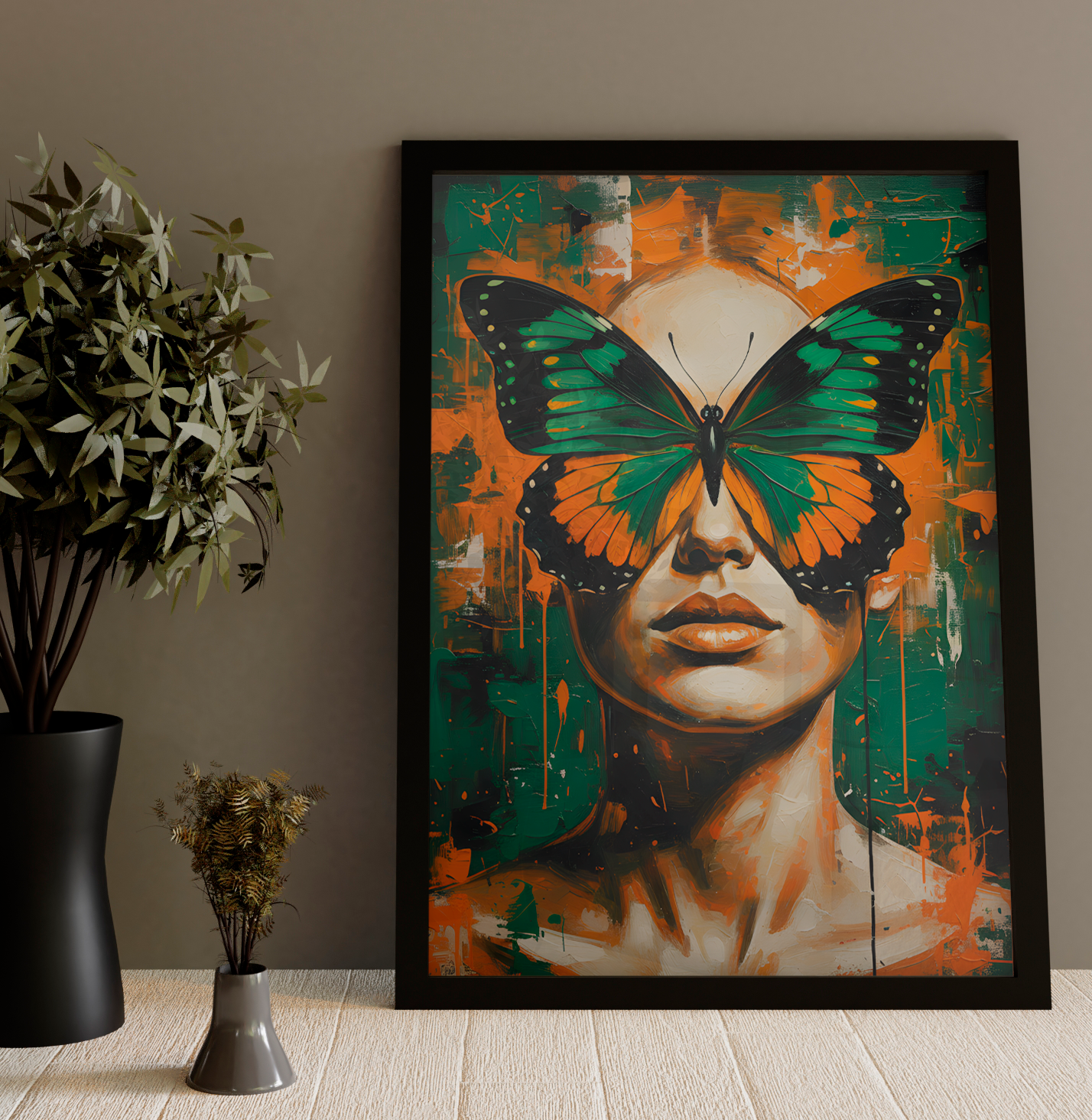 Paleta Vibrante e Texturizada: O contraste entre os tons de verde esmeralda e laranja intenso é acentuado por pinceladas expressivas no fundo, conferindo à arte uma textura rica que remete à pintura em tela.