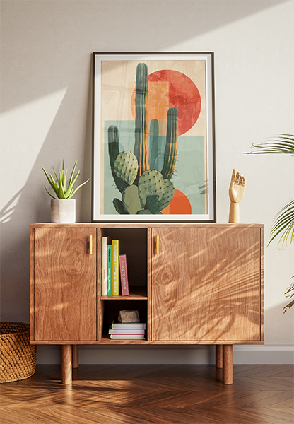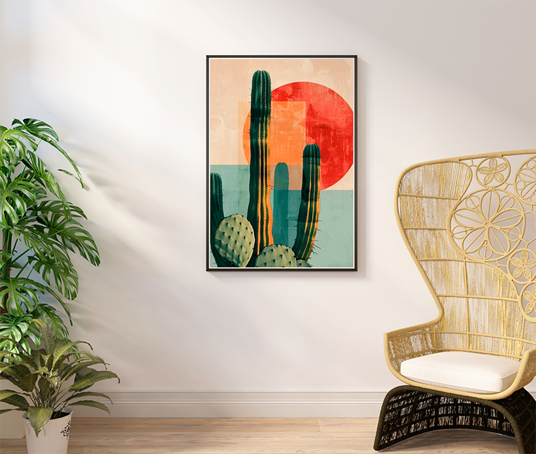 Paleta Terrosa e Solar: O contraste entre o verde profundo dos cactos, o vermelho vibrante do “sol” e os tons pastéis de azul e bege cria uma harmonia visual quente e equilibrada.