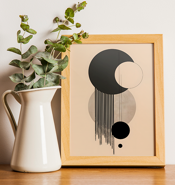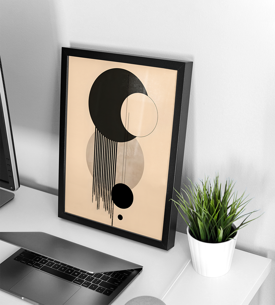 Uma peça que explora o equilíbrio entre formas circulares e linhas verticais, criando uma composição visual harmônica e contemporânea.