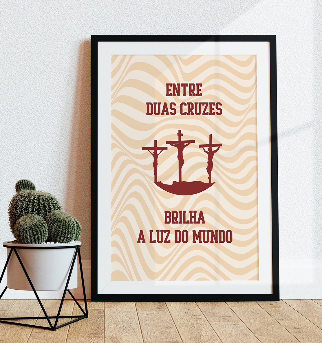 Simbolismo e Fé: A representação das três cruzes em silhueta sobre o horizonte reforça a mensagem bíblica de esperança, tornando-se um ponto de inspiração diária no lar.
