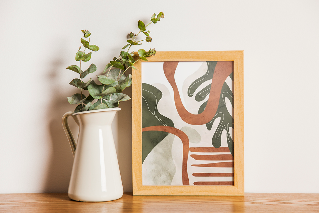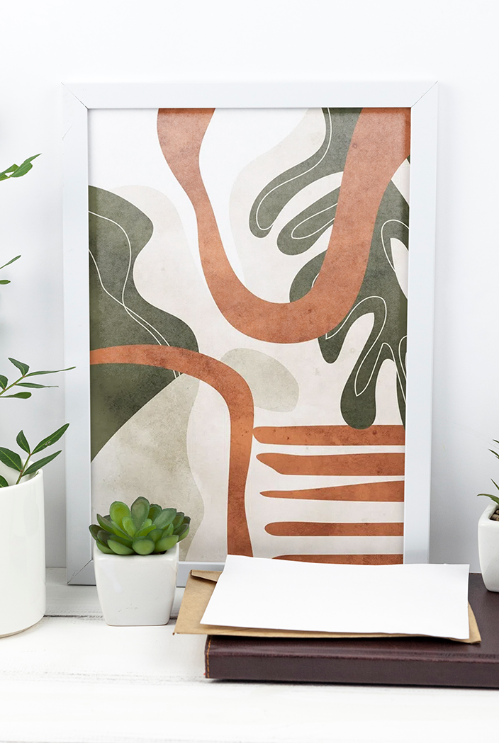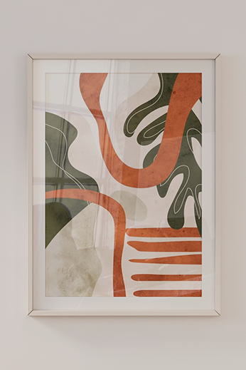 Uma dança fluida de formas orgânicas em tons terrosos e verdes, evocando equilíbrio e conexão com a natureza em um design contemporâneo.