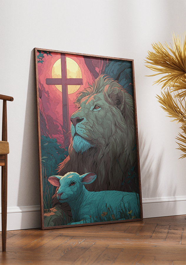 a força do Leão unida à mansidão do Cordeiro. Com um estilo de ilustração detalhado e cores que evocam o entardecer,