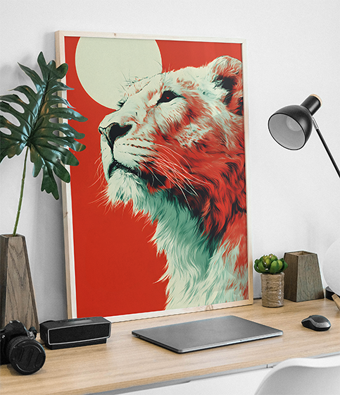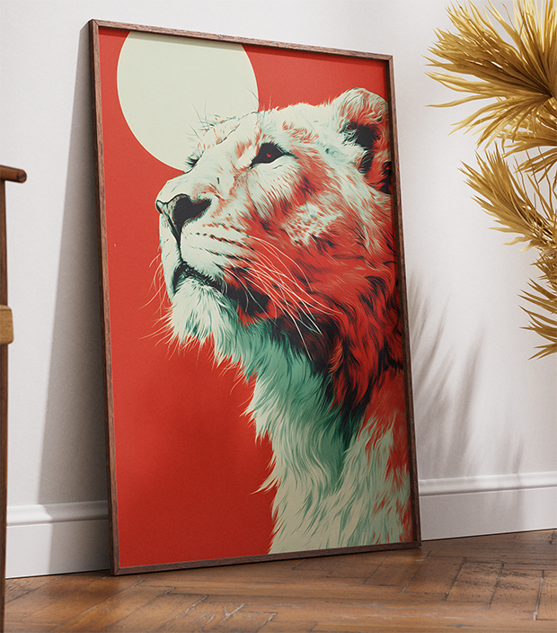 Paleta de Alto Impacto: O contraste profundo entre o fundo vermelho sólido e os tons de branco e verde-água do leão cria uma composição magnética e moderna.