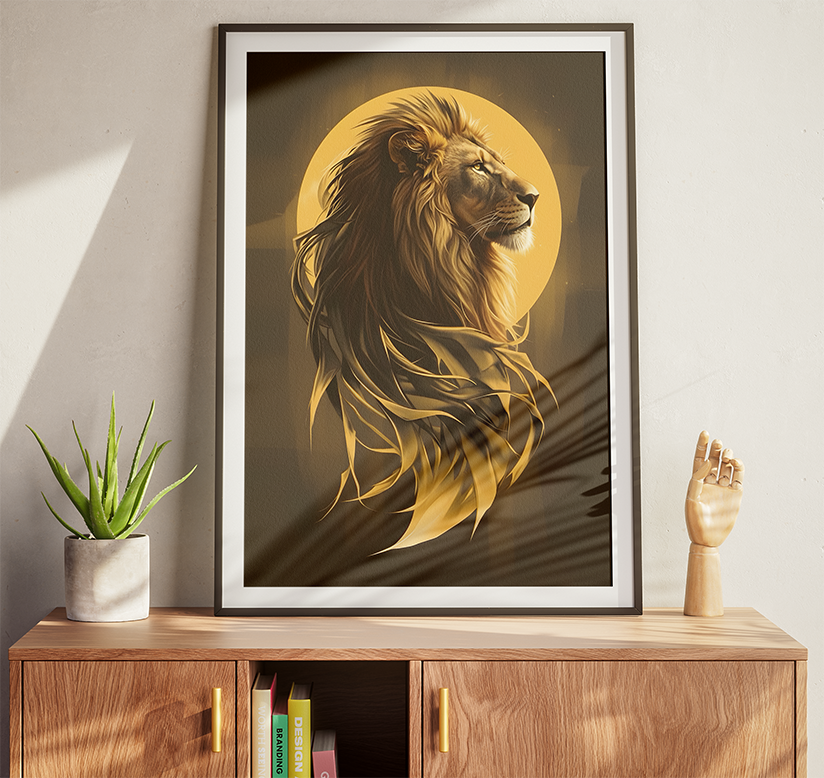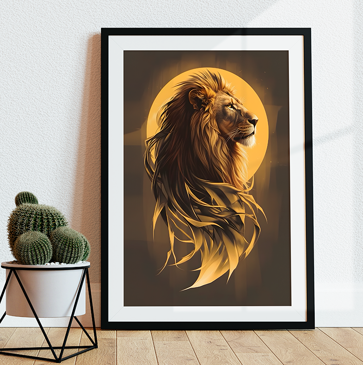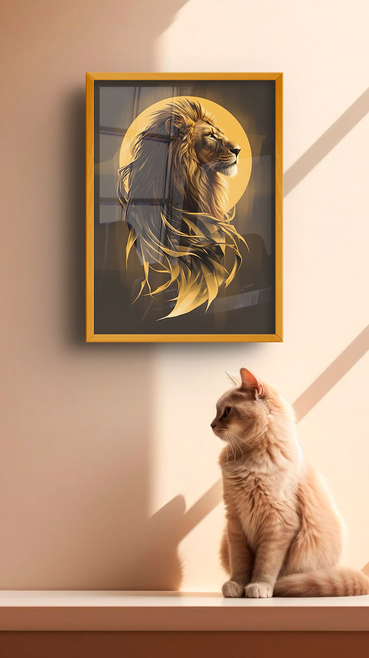 Estética Majestosa: A juba do leão é representada com traços fluidos que parecem chamas de ouro, conferindo um aspecto quase mítico e solar à imagem.