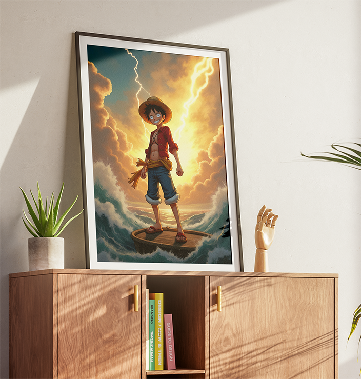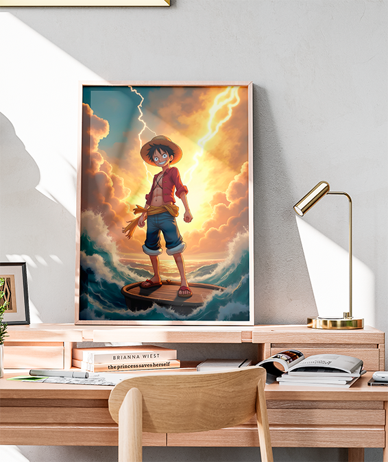 Composição épica de Luffy sob um céu de tempestade e raios, simbolizando sua jornada nos mares. Uma peça imponente para fãs que buscam uma decoração com atmosfera de aventura.