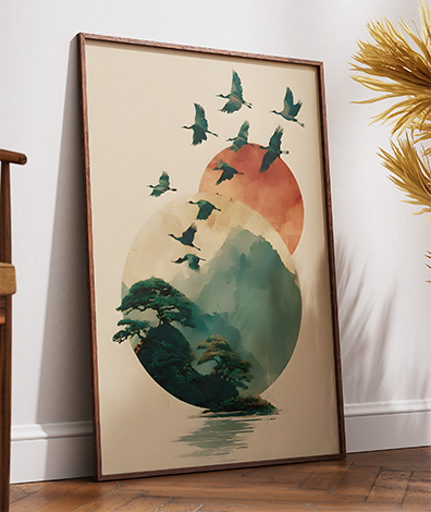 Paleta Zen: A suavidade dos tons de verde floresta e bege, contrastada com o vermelho terroso do sol, promove uma atmosfera de serenidade ideal para salas de estar ou áreas de meditação.