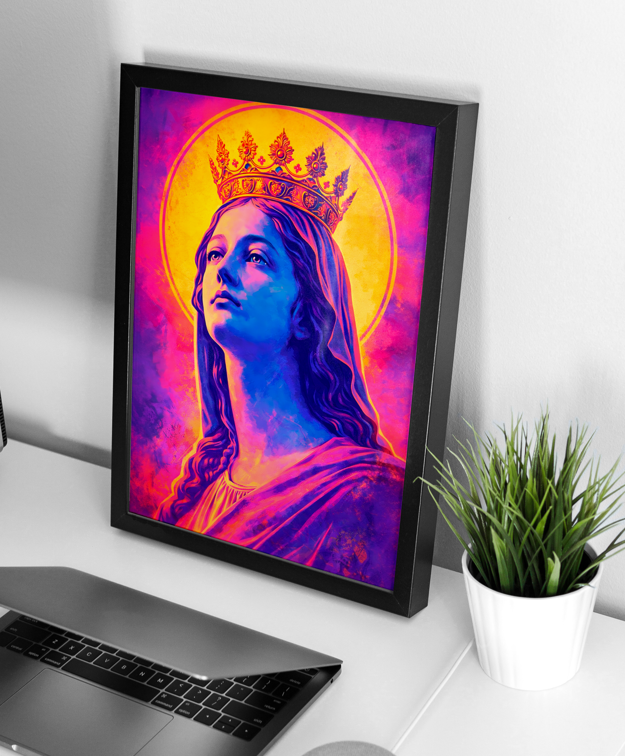 Simbolismo Iluminado: O halo dourado e a coroa detalhada reforçam a aura de majestade e proteção, tornando-o um ponto focal inspirador para salas, quartos ou altares pessoais.