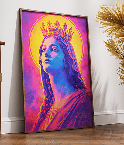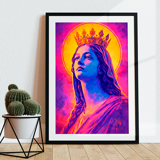 Arte Pop-Religiosa: A fusão de ícones tradicionais com uma paleta vibrante de violeta, rosa e azul cria uma peça de destaque que irradia energia e fé.