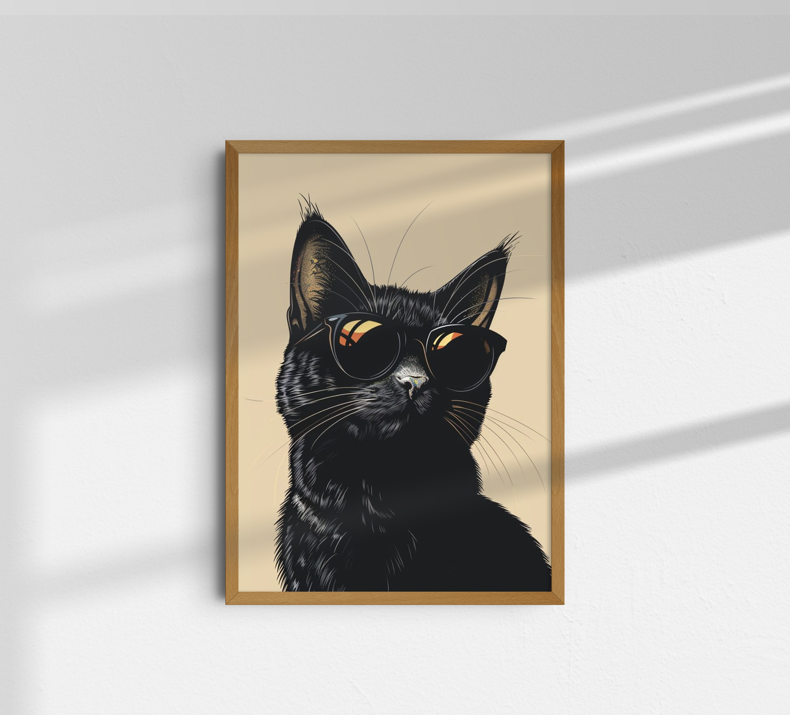 ostentando óculos escuros que refletem uma luz dourada, criando um visual que mistura o mistério clássico dos felinos com uma estética urbana e cool.