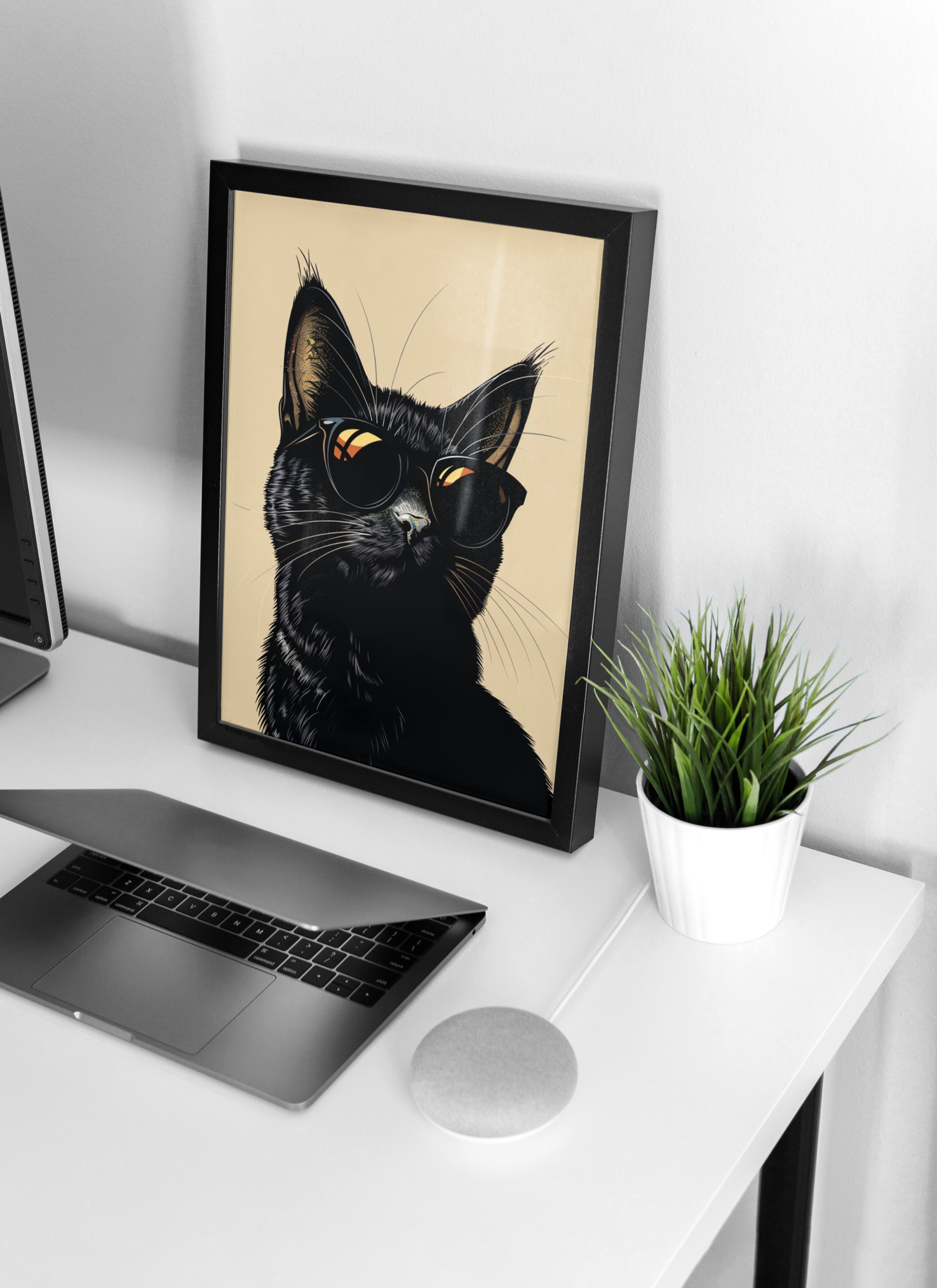 Estética Urbana: O acessório (óculos escuros) confere uma identidade única à peça, ideal para escritórios criativos ou salas modernas.