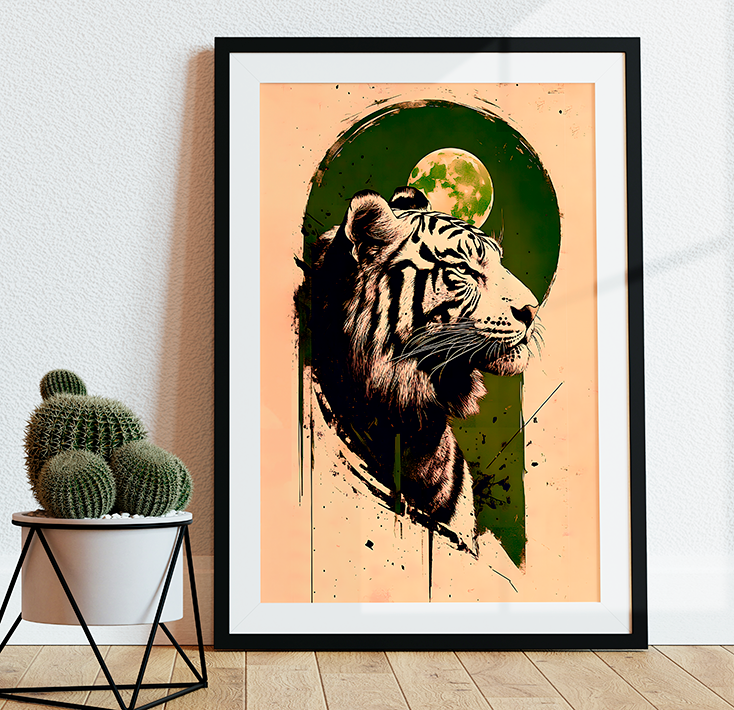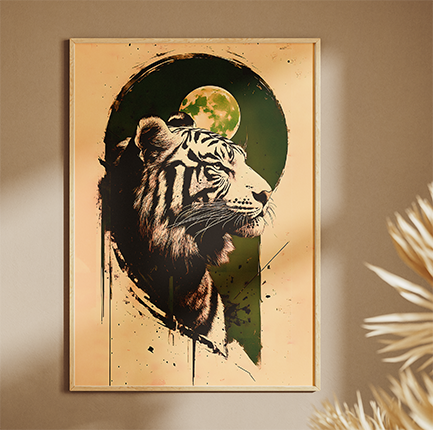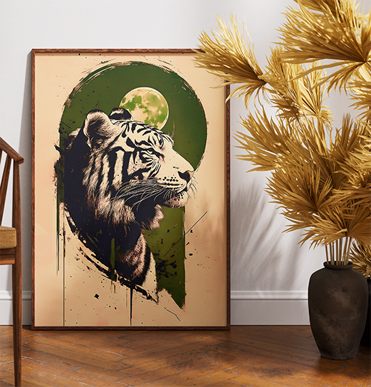 Design Impactante: A ilustração do tigre em perfil, com traços que remetem ao grafite e à arte digital, cria um foco visual magnético em qualquer parede.